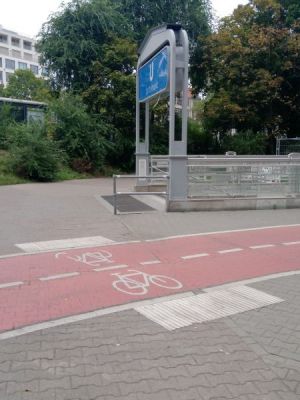 Der Radweg ist nur markiert, es gibt keine taktilen Elemente als Randbegrenzung. Das ist Vor-und Nachteil für geh- bzw. seheingeschränkte Personen, die einen wollen es nicht, die anderen brauchen es, um nicht in Gefahr zu geraten. In der direkten Nähe des U Bahnausgangs sind deswegen die taktilen Elemente angeordnet.